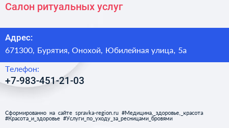 Салон ритуальных услуг по адресу 671300, Бурятия, Онохой, Юбилейная улица, 5а в дальнейшем Организация, размещена в следующих категориях: