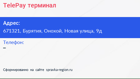 TelePay, терминал по адресу 671321, Бурятия, Онохой, Новая улица, 9д в дальнейшем Организация, размещена в следующих категориях: