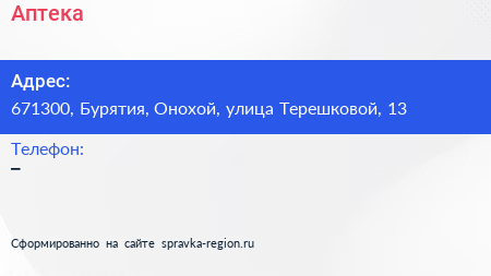 Аптека по адресу 671300, Бурятия, Онохой, улица Терешковой, 13 в дальнейшем Организация, размещена в следующих категориях: