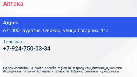 Аптека по адресу 671300, Бурятия, Онохой, улица Гагарина, 11а в дальнейшем Организация, размещена в следующих категориях: