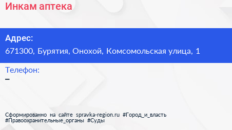 Инкам, аптека по адресу 671300, Бурятия, Онохой, Комсомольская улица, 1 в дальнейшем Организация, размещена в следующих категориях: