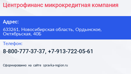 Центрофинанс, микрокредитная компания по адресу 633261, Новосибирская область, Ордынское, Октябрьская, 40Б в дальнейшем Организация, размещена в следующих категориях: