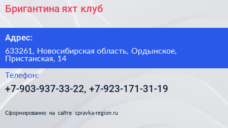 Бригантина, яхт-клуб по адресу 633261, Новосибирская область, Ордынское, Пристанская, 14 в дальнейшем Организация, размещена в следующих категориях: