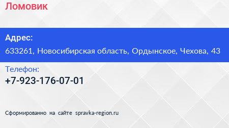 Ломовик по адресу 633261, Новосибирская область, Ордынское, Чехова, 43 в дальнейшем Организация, размещена в следующих категориях: