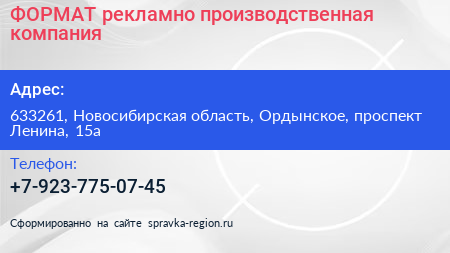 ФОРМАТ, рекламно-производственная компания по адресу 633261, Новосибирская область, Ордынское, проспект Ленина, 15а в дальнейшем Организация, размещена в следующих категориях: