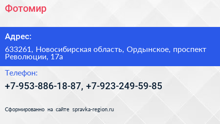 Фотомир по адресу 633261, Новосибирская область, Ордынское, проспект Революции, 17а в дальнейшем Организация, размещена в следующих категориях: