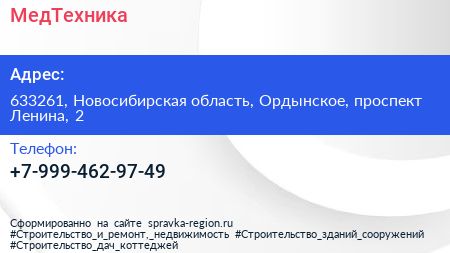 МедТехника по адресу 633261, Новосибирская область, Ордынское, проспект Ленина, 2 в дальнейшем Организация, размещена в следующих категориях: