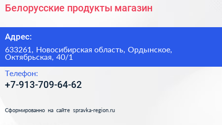 Белорусские продукты, магазин по адресу 633261, Новосибирская область, Ордынское, Октябрьская, 40/1 в дальнейшем Организация, размещена в следующих категориях:
