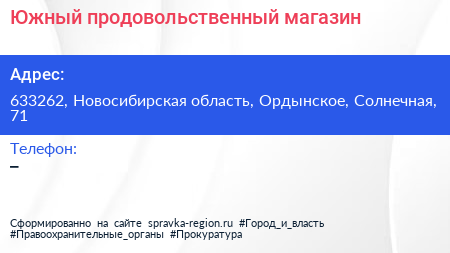 Южный, продовольственный магазин по адресу 633262, Новосибирская область, Ордынское, Солнечная, 71 в дальнейшем Организация, размещена в следующих категориях: