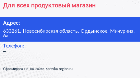 Для всех, продуктовый магазин по адресу 633261, Новосибирская область, Ордынское, Мичурина, 6а в дальнейшем Организация, размещена в следующих категориях: