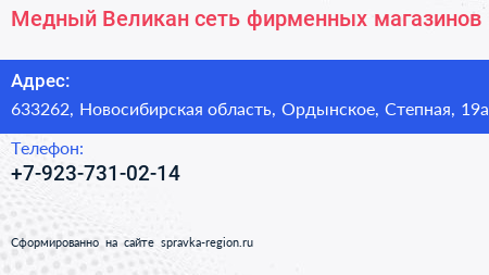 Медный Великан, сеть фирменных магазинов по адресу 633262, Новосибирская область, Ордынское, Степная, 19а в дальнейшем Организация, размещена в следующих категориях:
