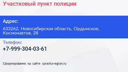 Участковый пункт полиции по адресу 633262, Новосибирская область, Ордынское, Космонавтов, 28 в дальнейшем Организация, размещена в следующих категориях: