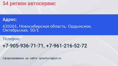 54 регион, автосервис по адресу 633261, Новосибирская область, Ордынское, Октябрьская, 50/1 в дальнейшем Организация, размещена в следующих категориях: