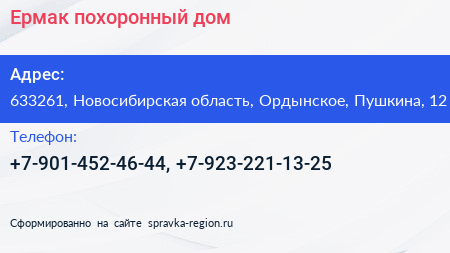 Ермак, похоронный дом по адресу 633261, Новосибирская область, Ордынское, Пушкина, 12 в дальнейшем Организация, размещена в следующих категориях: