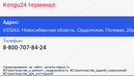 Kengu24, терминал по адресу 633262, Новосибирская область, Ордынское, Полевая, 28а в дальнейшем Организация, размещена в следующих категориях:
