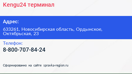 Kengu24, терминал по адресу 633261, Новосибирская область, Ордынское, Октябрьская, 23 в дальнейшем Организация, размещена в следующих категориях: