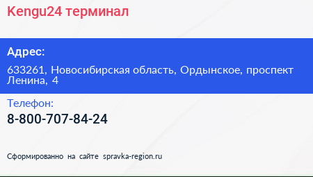 Kengu24, терминал по адресу 633261, Новосибирская область, Ордынское, проспект Ленина, 4 в дальнейшем Организация, размещена в следующих категориях:
