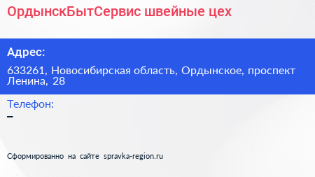 ОрдынскБытСервис, швейные цех по адресу 633261, Новосибирская область, Ордынское, проспект Ленина, 28 в дальнейшем Организация, размещена в следующих категориях:
