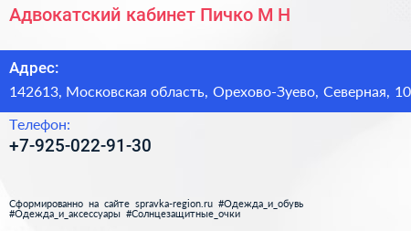 Адвокатский кабинет Пичко М.Н. по адресу 142613, Московская область, Орехово-Зуево, Северная, 10 в дальнейшем Организация, размещена в следующих категориях: