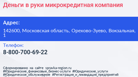 Деньги в руки, микрокредитная компания по адресу 142600, Московская область, Орехово-Зуево, Вокзальная, 1 в дальнейшем Организация, размещена в следующих категориях: