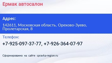 Ермак, автосалон по адресу 142611, Московская область, Орехово-Зуево, Пролетарская, 8 в дальнейшем Организация, размещена в следующих категориях: