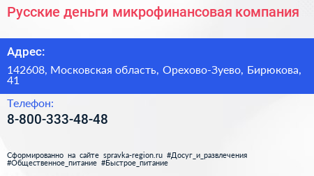 Русские деньги, микрофинансовая компания по адресу 142608, Московская область, Орехово-Зуево, Бирюкова, 41 в дальнейшем Организация, размещена в следующих категориях: