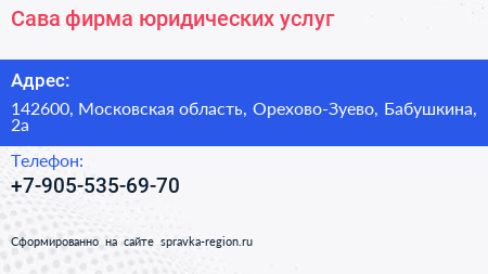 Сава, фирма юридических услуг по адресу 142600, Московская область, Орехово-Зуево, Бабушкина, 2а в дальнейшем Организация, размещена в следующих категориях: