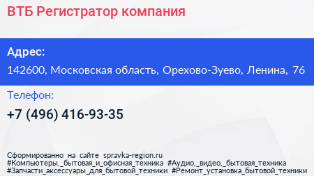 ВТБ Регистратор, компания по адресу 142600, Московская область, Орехово-Зуево, Ленина, 76 в дальнейшем Организация, размещена в следующих категориях: