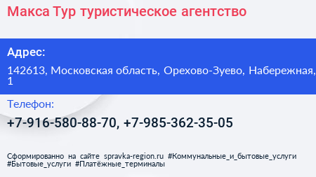 Макса-Тур, туристическое агентство по адресу 142613, Московская область, Орехово-Зуево, Набережная, 1 в дальнейшем Организация, размещена в следующих категориях: