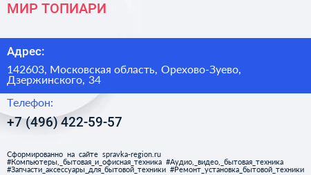 МИР ТОПИАРИ по адресу 142603, Московская область, Орехово-Зуево, Дзержинского, 34 в дальнейшем Организация, размещена в следующих категориях: