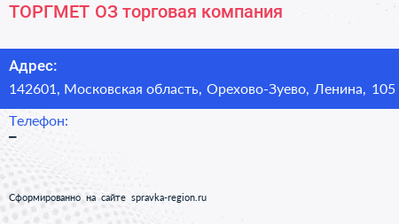 ТОРГМЕТ-ОЗ, торговая компания по адресу 142601, Московская область, Орехово-Зуево, Ленина, 105 в дальнейшем Организация, размещена в следующих категориях: