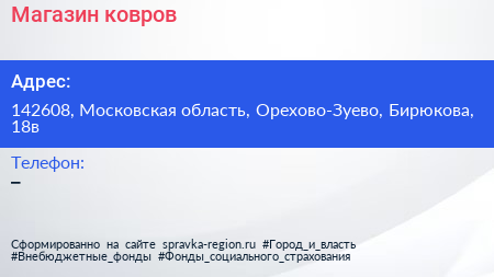 Магазин ковров по адресу 142608, Московская область, Орехово-Зуево, Бирюкова, 18в в дальнейшем Организация, размещена в следующих категориях: