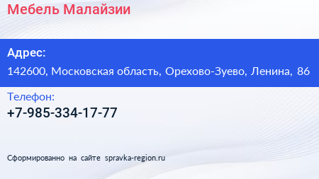 Мебель Малайзии по адресу 142600, Московская область, Орехово-Зуево, Ленина, 86 в дальнейшем Организация, размещена в следующих категориях: