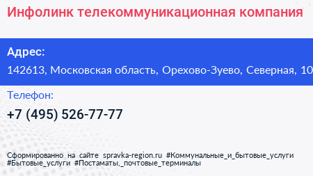 Инфолинк, телекоммуникационная компания по адресу 142613, Московская область, Орехово-Зуево, Северная, 10 в дальнейшем Организация, размещена в следующих категориях: