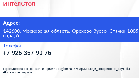 ИнтелСтол по адресу 142600, Московская область, Орехово-Зуево, Стачки 1885 года, 6 в дальнейшем Организация, размещена в следующих категориях: