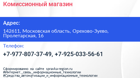 Комиссионный магазин по адресу 142611, Московская область, Орехово-Зуево, Пролетарская, 16 в дальнейшем Организация, размещена в следующих категориях: