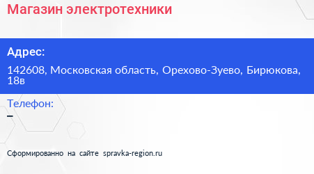 Магазин электротехники по адресу 142608, Московская область, Орехово-Зуево, Бирюкова, 18в в дальнейшем Организация, размещена в следующих категориях: