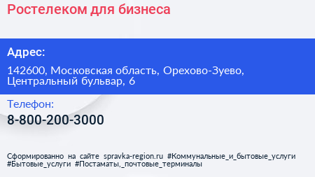 Ростелеком для бизнеса по адресу 142600, Московская область, Орехово-Зуево, Центральный бульвар, 6 в дальнейшем Организация, размещена в следующих категориях:
