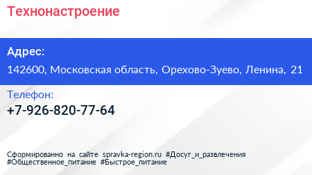 Технонастроение по адресу 142600, Московская область, Орехово-Зуево, Ленина, 21 в дальнейшем Организация, размещена в следующих категориях:
