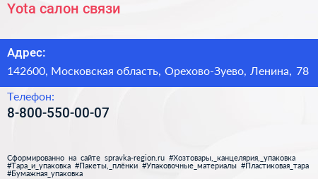 Yota, салон связи по адресу 142600, Московская область, Орехово-Зуево, Ленина, 78 в дальнейшем Организация, размещена в следующих категориях: