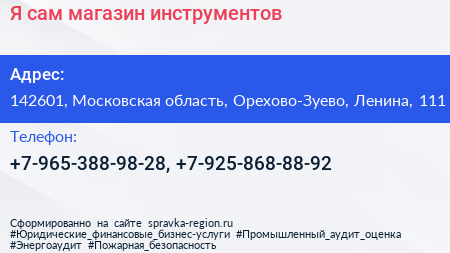 Я сам, магазин инструментов по адресу 142601, Московская область, Орехово-Зуево, Ленина, 111 в дальнейшем Организация, размещена в следующих категориях: