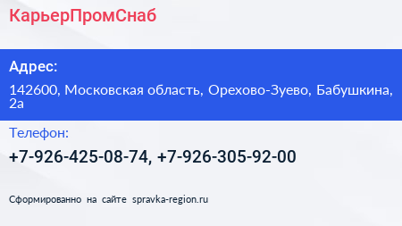 КарьерПромСнаб по адресу 142600, Московская область, Орехово-Зуево, Бабушкина, 2а в дальнейшем Организация, размещена в следующих категориях:
