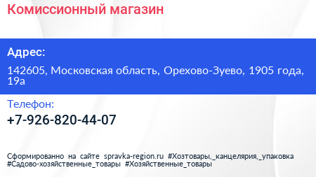 Комиссионный магазин по адресу 142605, Московская область, Орехово-Зуево, 1905 года, 19а в дальнейшем Организация, размещена в следующих категориях: