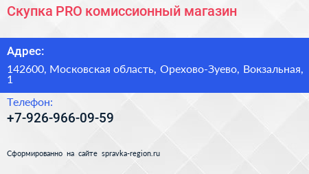 Скупка PRO, комиссионный магазин по адресу 142600, Московская область, Орехово-Зуево, Вокзальная, 1 в дальнейшем Организация, размещена в следующих категориях: