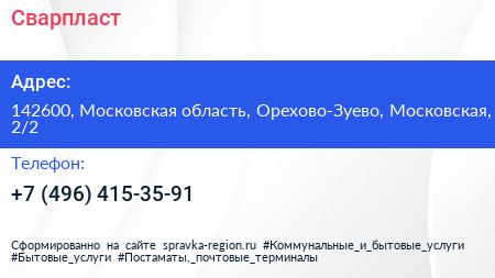 Сварпласт по адресу 142600, Московская область, Орехово-Зуево, Московская, 2/2 в дальнейшем Организация, размещена в следующих категориях: