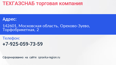 ТЕХГАЗСНАБ, торговая компания по адресу 142601, Московская область, Орехово-Зуево, Торфобрикетная, 2 в дальнейшем Организация, размещена в следующих категориях: