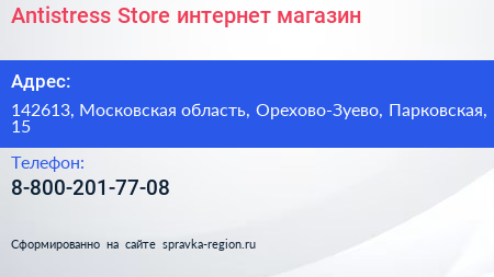 Antistress.Store, интернет-магазин по адресу 142613, Московская область, Орехово-Зуево, Парковская, 15 в дальнейшем Организация, размещена в следующих категориях: