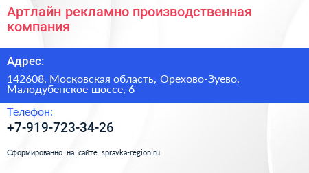 Артлайн, рекламно-производственная компания по адресу 142608, Московская область, Орехово-Зуево, Малодубенское шоссе, 6 в дальнейшем Организация, размещена в следующих категориях: