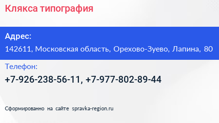 Клякса, типография по адресу 142611, Московская область, Орехово-Зуево, Лапина, 80 в дальнейшем Организация, размещена в следующих категориях: