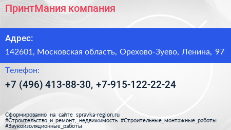 ПринтМания, компания по адресу 142601, Московская область, Орехово-Зуево, Ленина, 97 в дальнейшем Организация, размещена в следующих категориях: